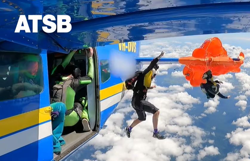 Faire un article sur l’accident à queenslan en australie avec le parachutiste accroché à l’empennage